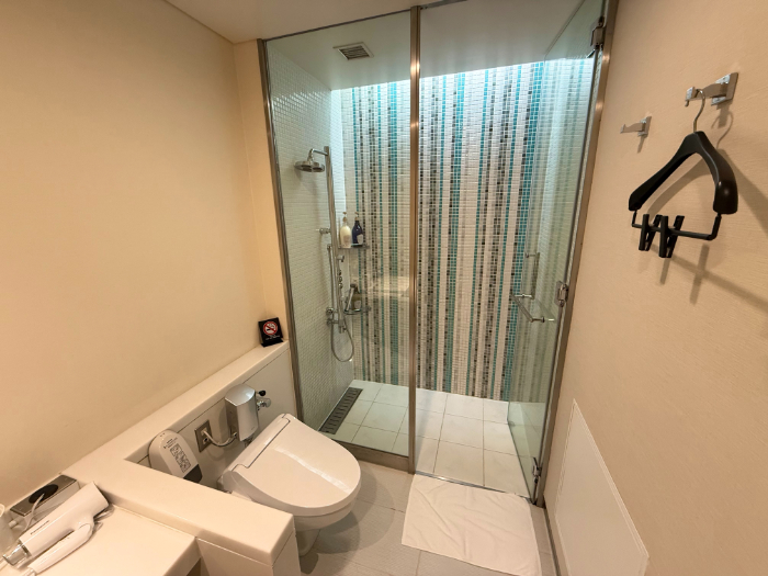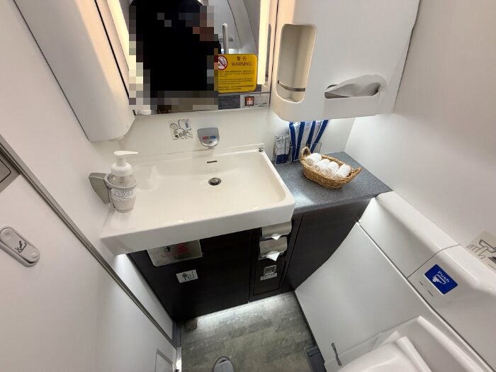 ファーストクラスのトイレは2ヶ所あり、通常の1.5倍くらいの広さがあります