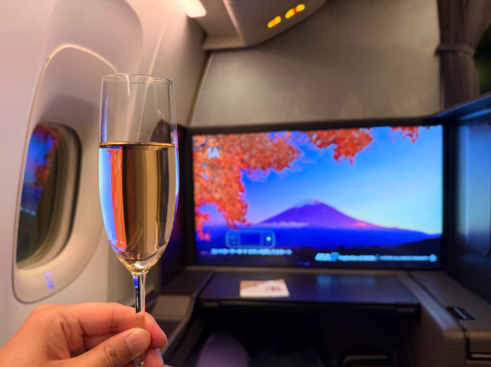 離陸までの時間に、シャンパンをいただきました!アメニティなどもいただいて離陸が始まります