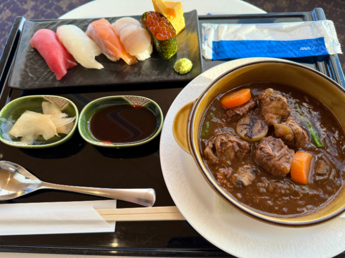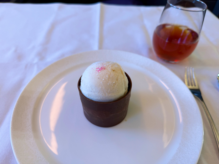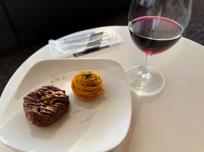 着陸前の食事は、お好きな時にの「洋食 or 和食」がおすすめ。今回はお好きな時にの洋食メイン料理だけ+搭乗後のコース料理からデザートを選択。搭乗後のコース料理は余りがあれば、いつでも提供してくれます。さすがファーストクラス。もはや食べ飲み放題!