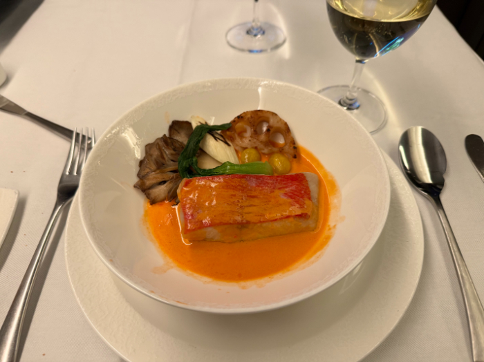 ボタンエビの何とか。メニュー名が難しいので割愛しますが、カレーに似たスパイスが効いていて美味しかったです!日本発の機内食はレベルが高いです