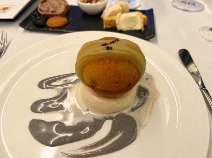 さつまいもの何とか(割愛)。下にはバニラアイスと黒ゴマのソースがかかっていて、上の本体は温かくて手が込んでいます。ほんとに高級レストランのような食事でした!