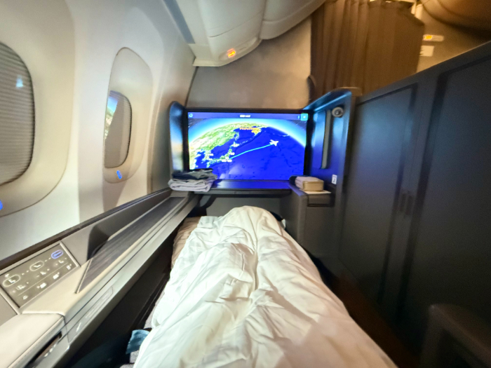 食事が終わると、機内がだんだんと暗くなります。無料でもらえるパジャマ(持ち帰り可能)に着替えて、眠りにつきます!