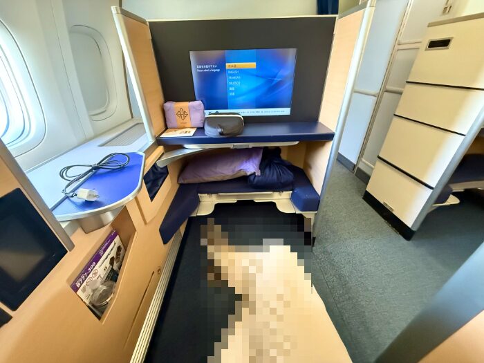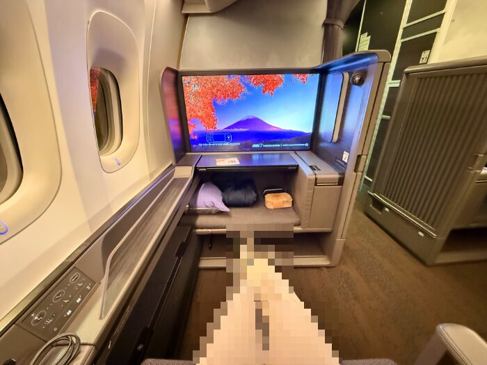 成田↔シカゴの路線は20%~30%くらいの割合で、旧型のシートになっています。男性が足を伸ばしても、前には届きません!