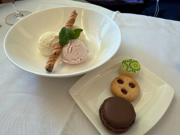 デザートはアイスの盛り合わせ、右側はプティフール(マカロン・クッキー・チョコ)