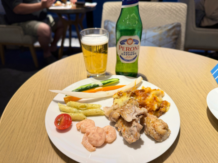 おつまみのメニューは5種類くらいと少ないですが、チキンソテー、グラタン、ペンネ、エビのオーロラソース、野菜スティックなど満足のいくメニューでした