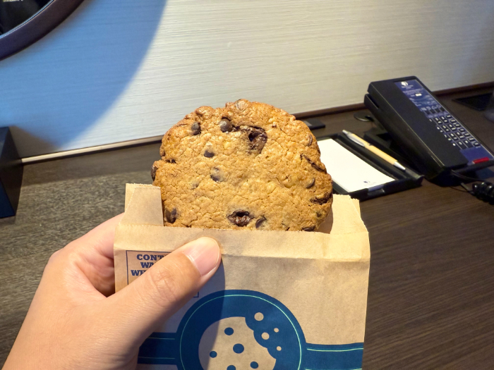 ダブルツリーといば、チョコチップクッキー。チェックインの際に、フロントで人数分をもらえます。本国アメリカよりも甘さが控えめでした