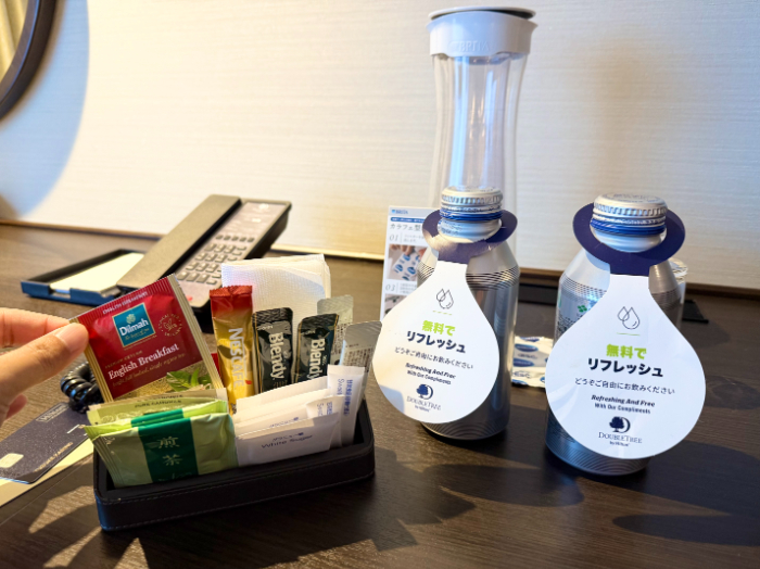 紅茶やコーヒーもありまして、お水は2本が無料。あと浄水機能付きのボトルが1つありました
