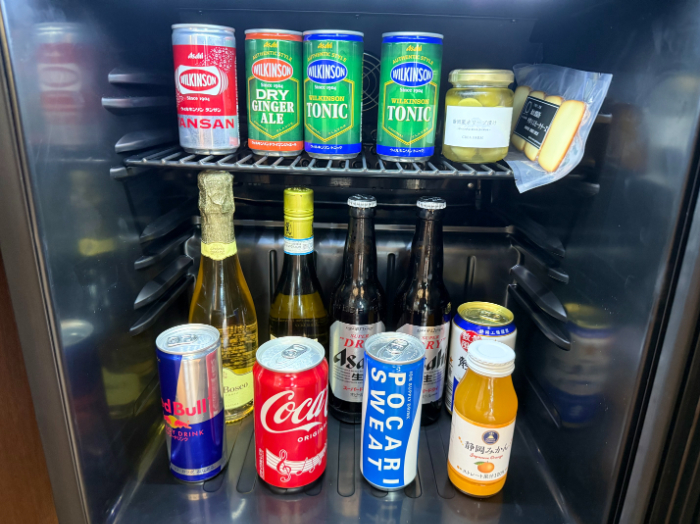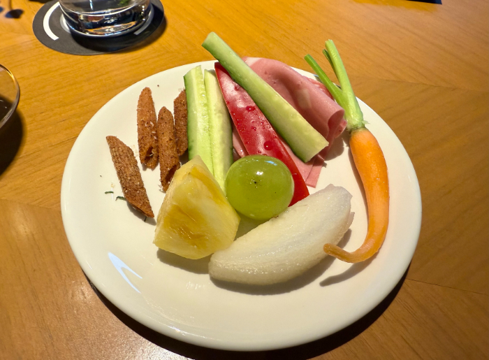 ちょっとしたおつまみもいただけます。野菜やフルーツが多くていいですね。こちらはビュッフェスタイル