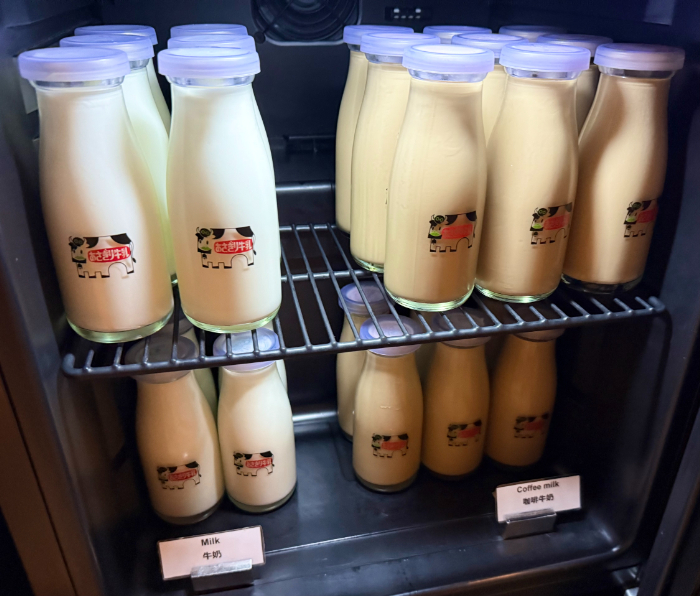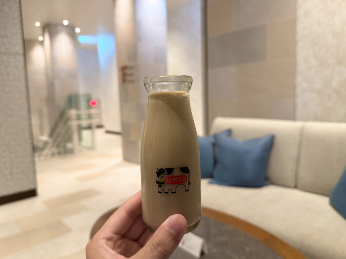 お風呂上りの待合スペースでは、牛乳・コーヒー牛乳・ミント緑茶をいただけます。牛乳は250円/本もするそうで、濃厚で美味しかったです!