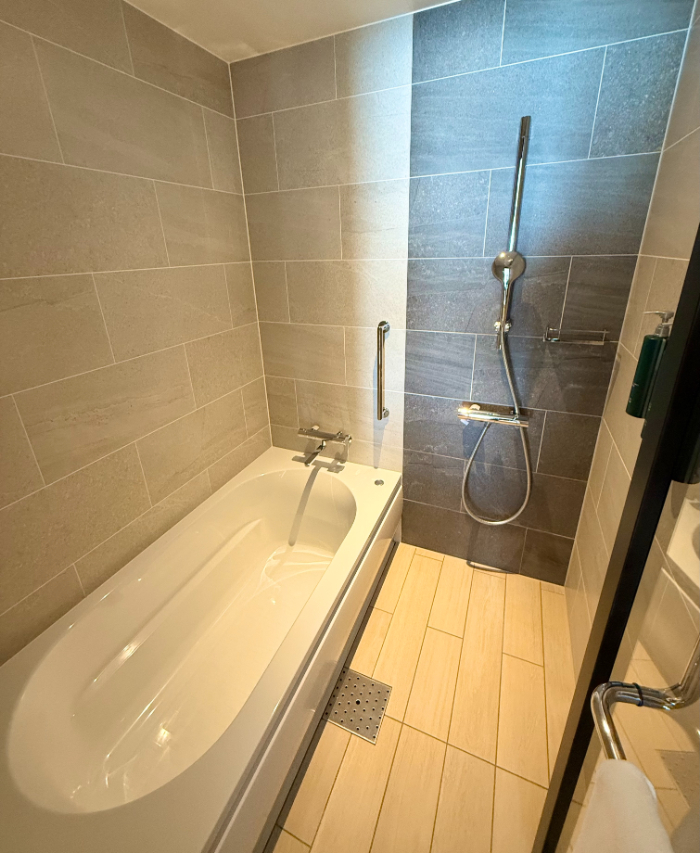 シャワーはハンディタイプのみ。浴槽が広くて嬉しいです!
