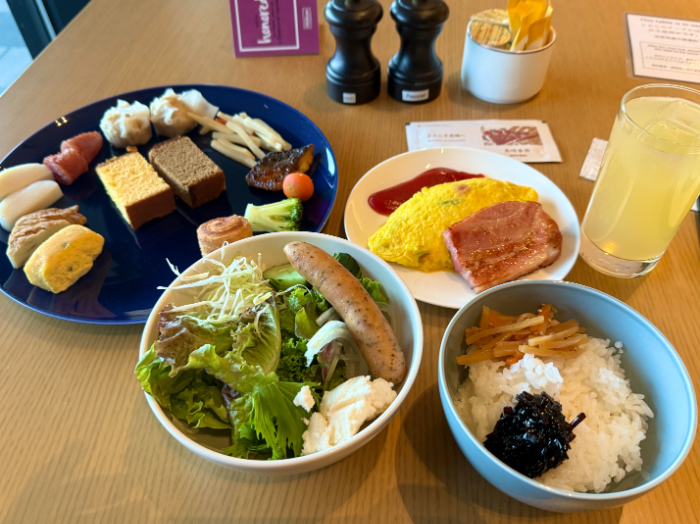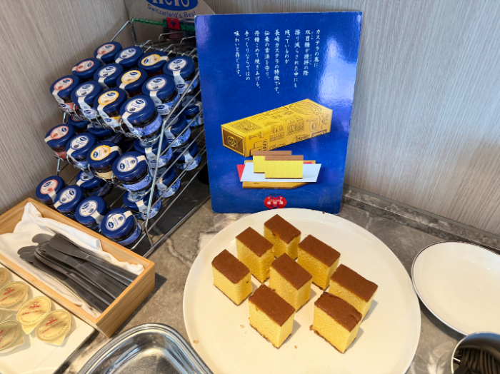 オムレツはオーダー式で作ってくれます。長崎のかまぼこ・カステラなど地元のメニューがいただけて、満足の朝食でした(右側のカステラはコーヒー味)