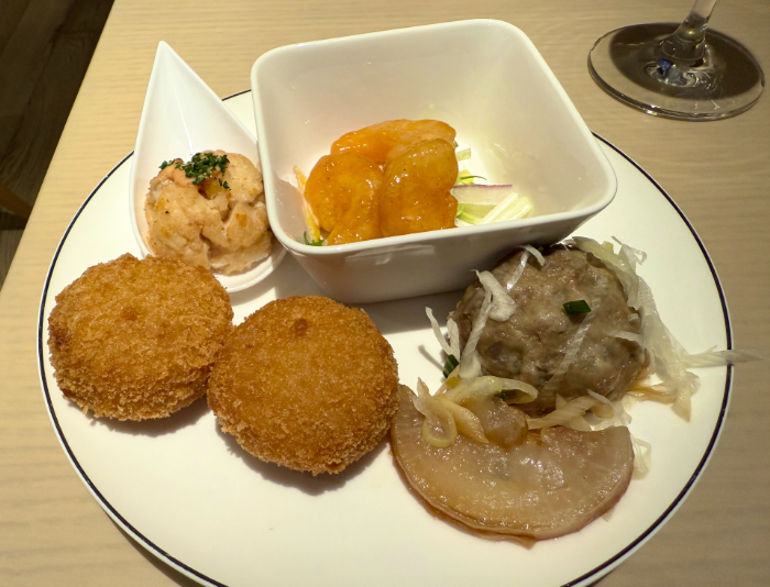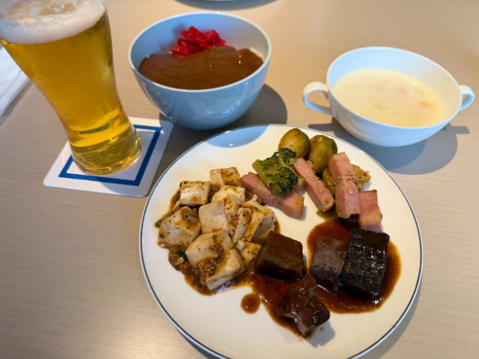 ヒルトン長崎のラウンジはとても豪華!長崎は日本三大中華街の1つがありますので、ホットミールは中華料理が3種類ありました(角煮・マーボー豆腐など)。さらに、カレーとクラムチャウダーがありまして、お腹いっぱいになります