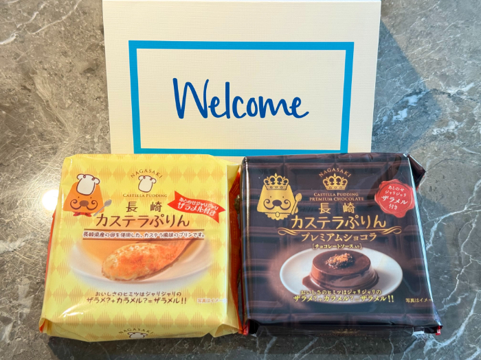 ウェルカムスイーツはプリンでした!冷蔵庫で冷やして食べると美味しかったです(中にスプーン有り)