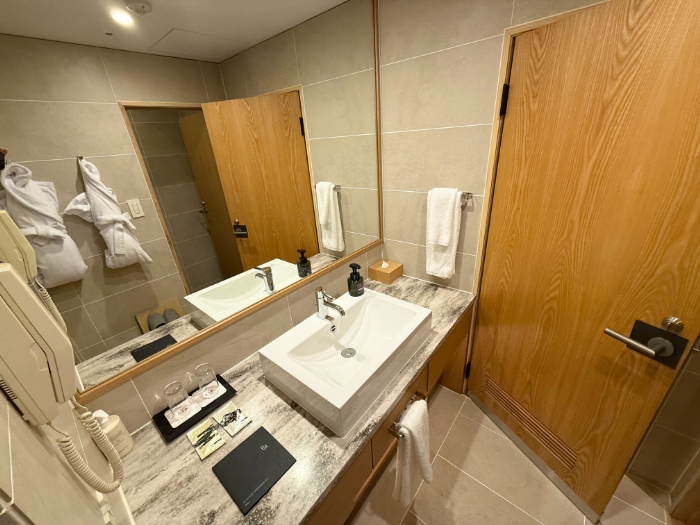 洗面台も広いです!洗面ボウルは1つでした。ふかふかのバスローブもあります