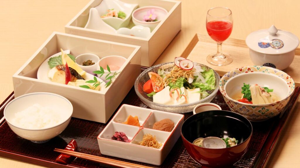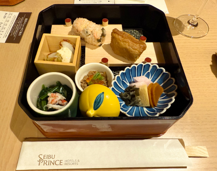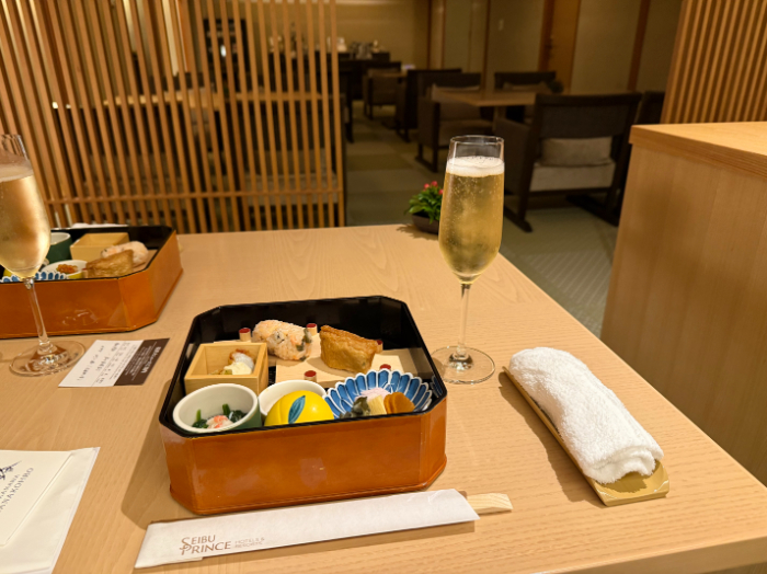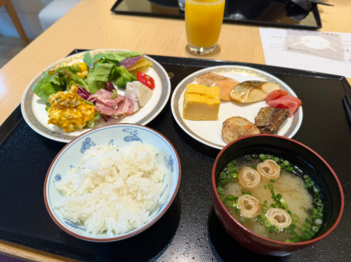 朝食は和食かビュッフェ(同じ建物1階のグランドプリンス高輪)を選択可能。また、和食の場合は客室でいただくか、ラウンジでいただくかを選べます