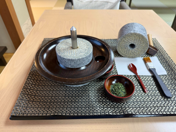 石臼で抹茶をひいて、お好みでモンブランの上にかけていただきます。ドリンクはカフェラテをいただきました