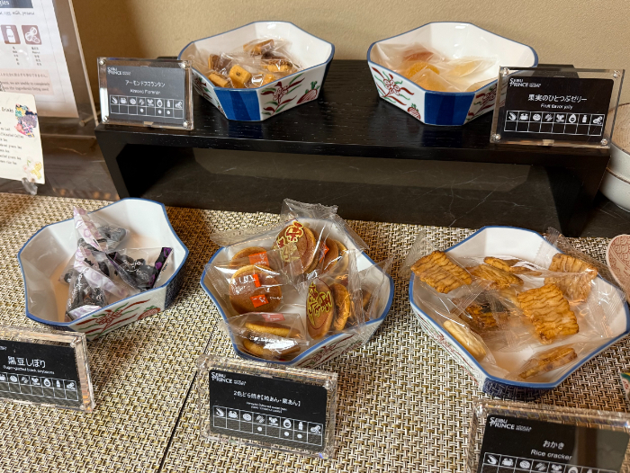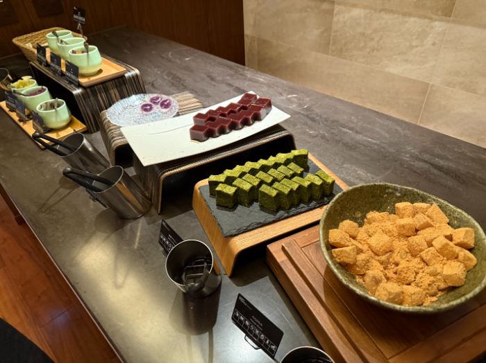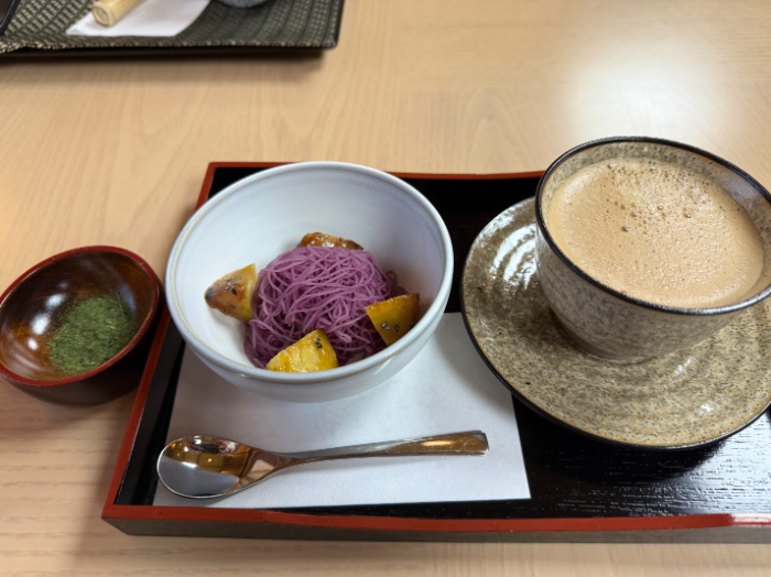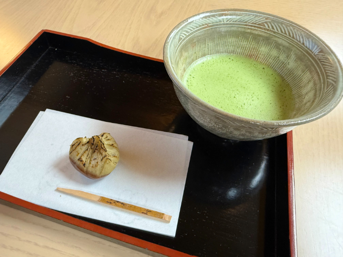 チェックイン手続きの間に、お茶などをいただけます。秋なのでクリのお菓子でした