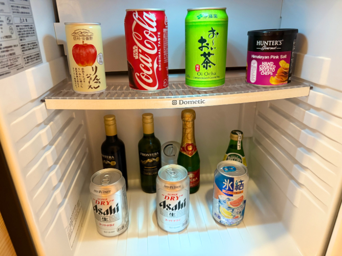 なんと、冷蔵庫内のドリンクは全て無料!ビールやワインもあります